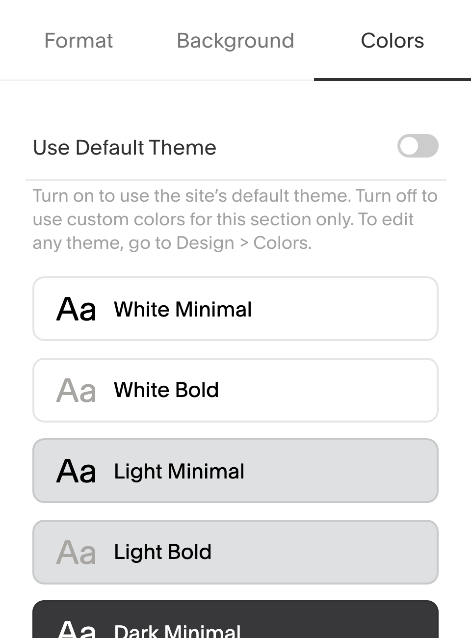 While creating or editing a section on one of your pages, the Colors tab reveals the applied color theme. Unless it’s been changed, the default theme will be enabled.
